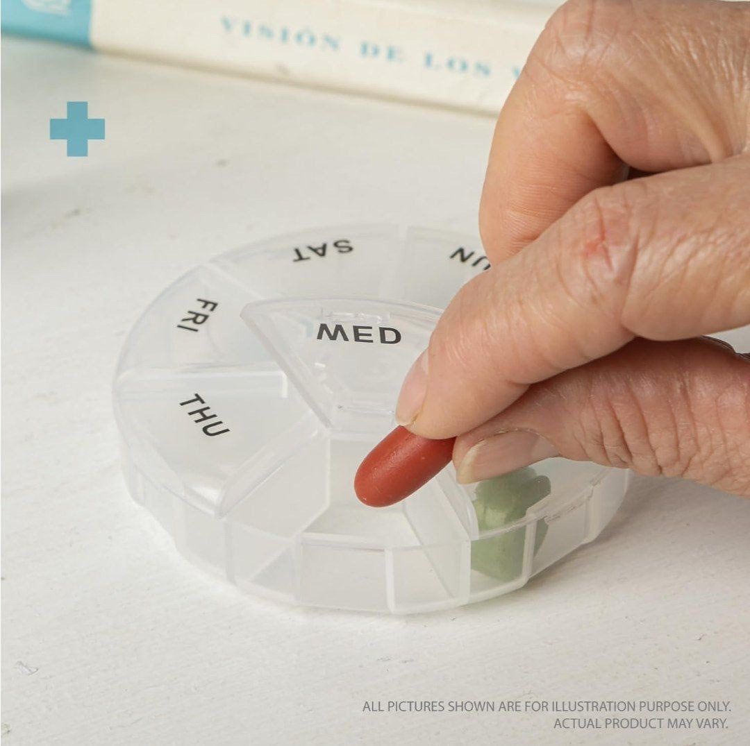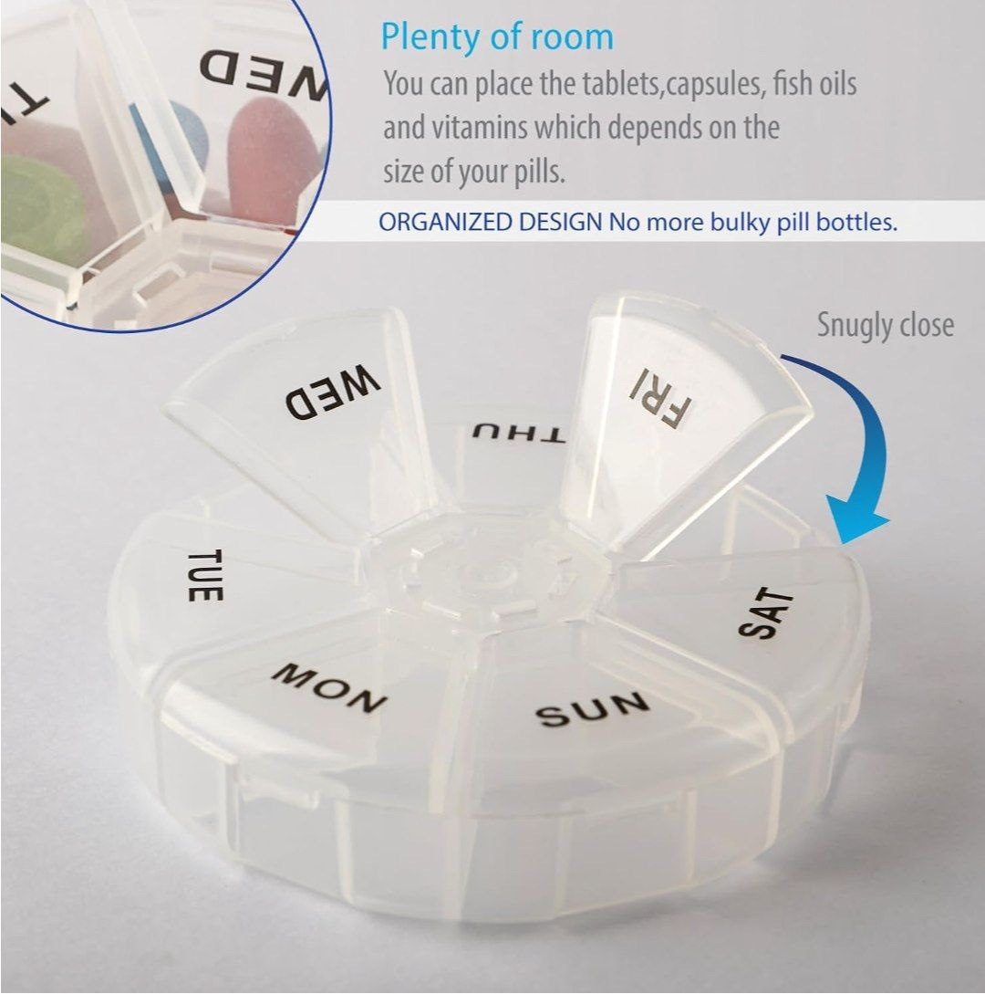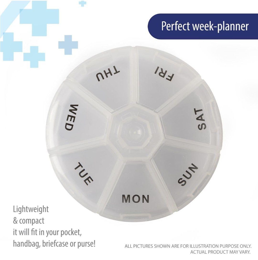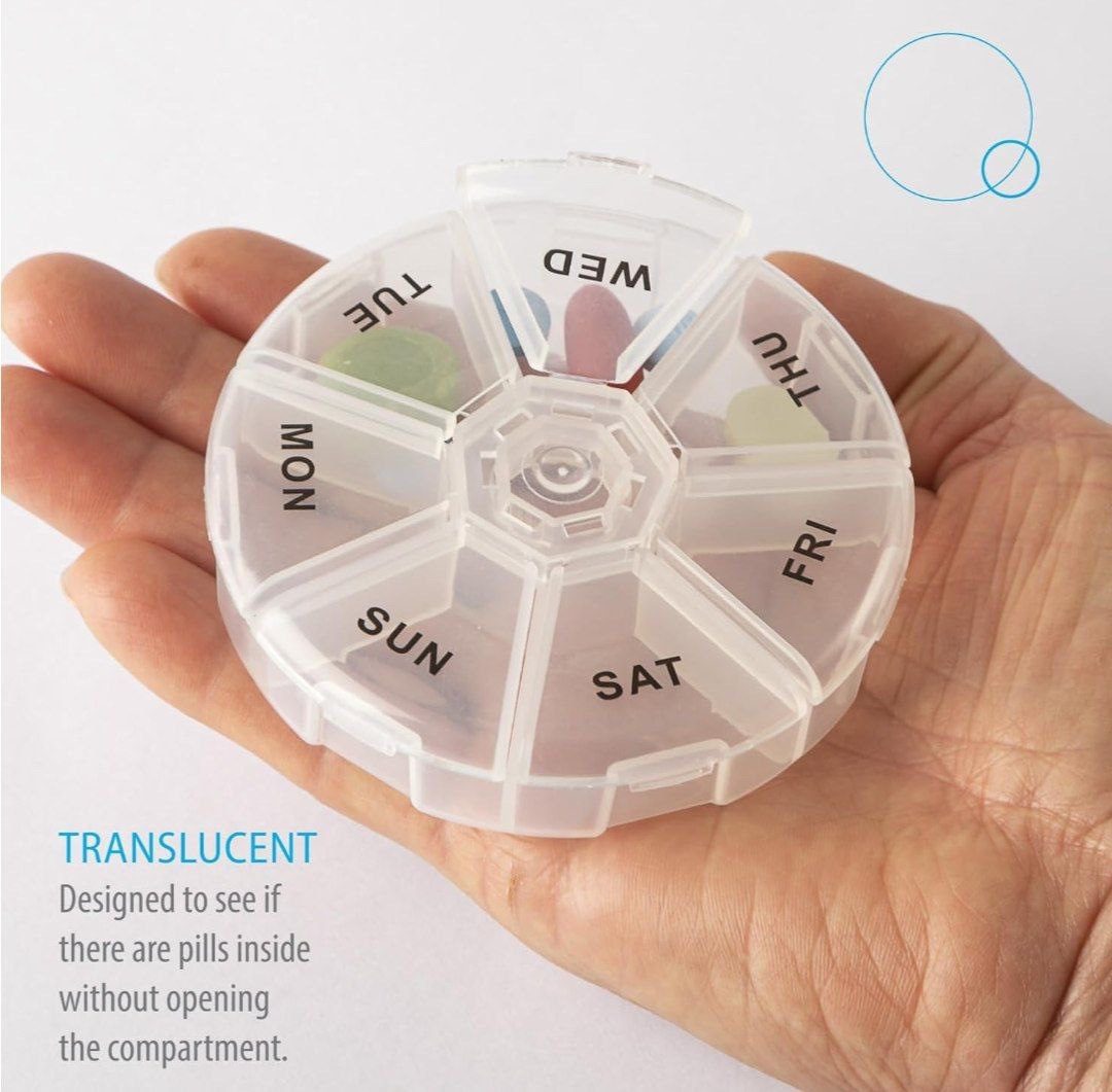 علبة شفافة دائرية لتنظيم الأدوية أسبوعيا.
