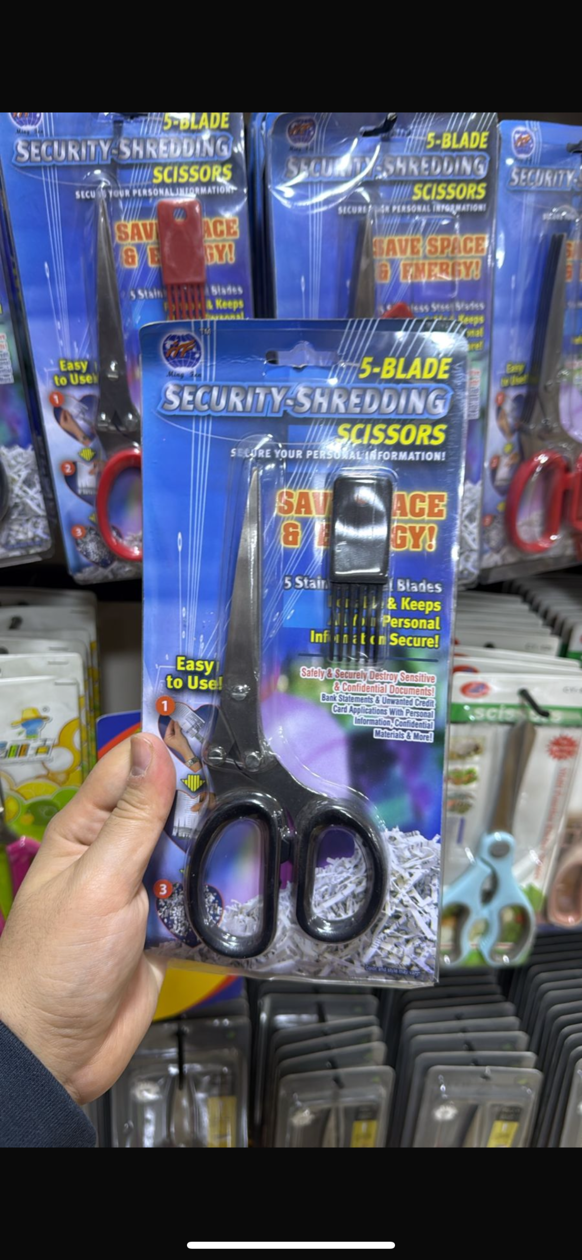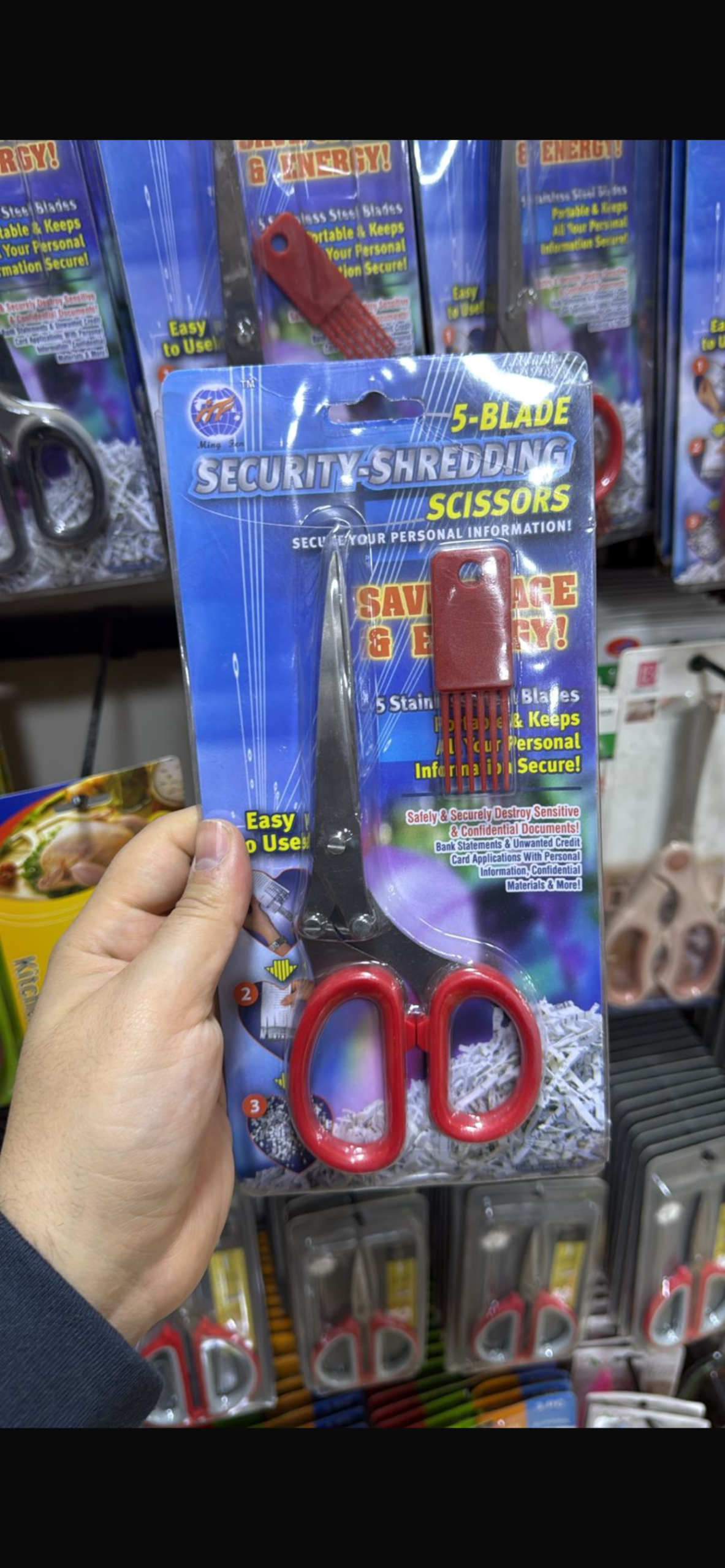 مقص متعدد الشفرات بتقنية التقطيع الأمني، مثالي لإتلاف المستندات المهمة، الفواتير، والأوراق الشخصية بسرعة وسهولة.